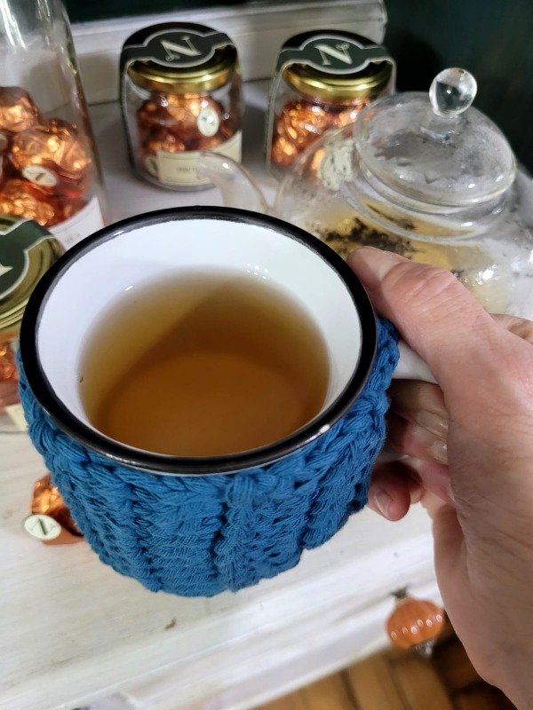 Taza de cerámica blanca con borde en negro. Con cubre taza al crochet y señalador haciendo juego en color crudo o azul.